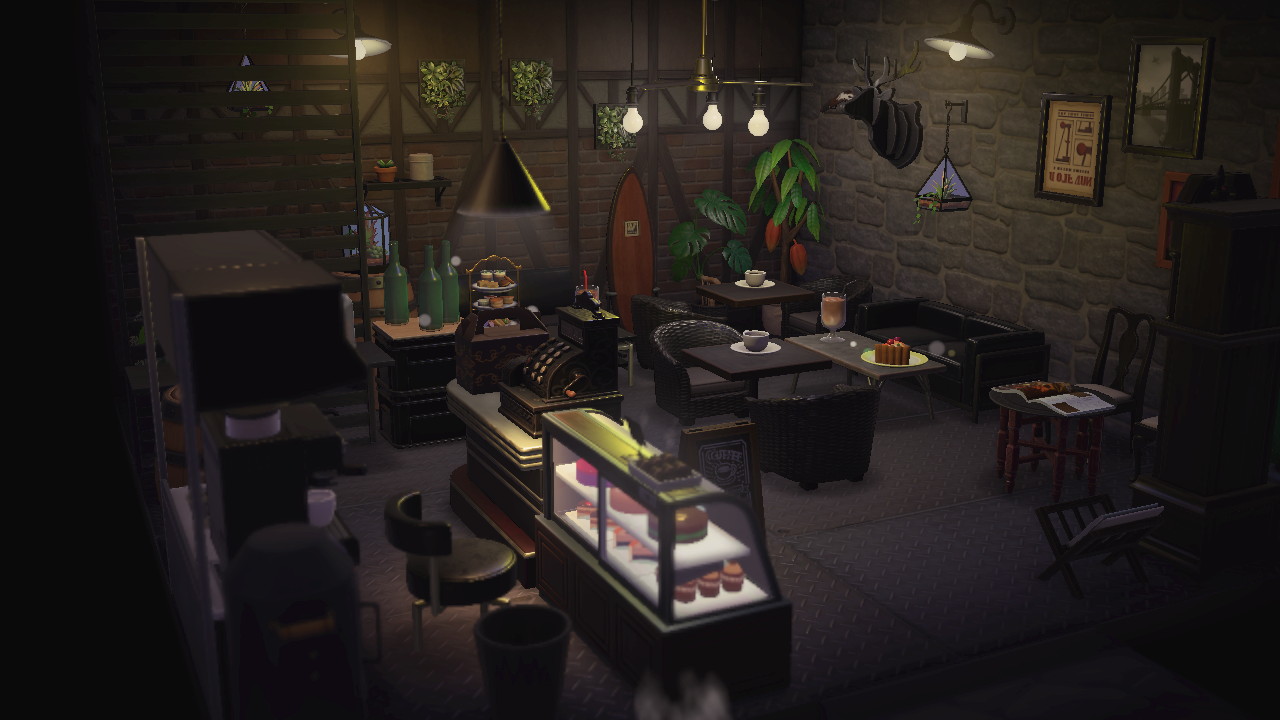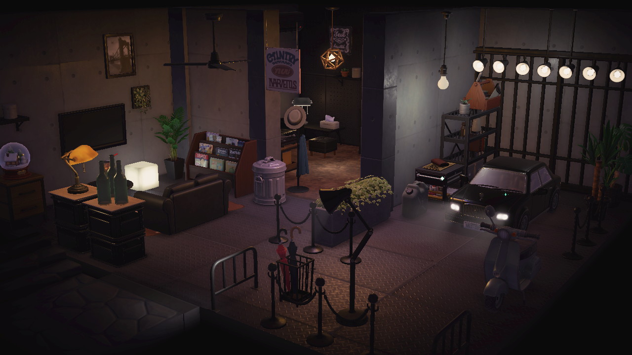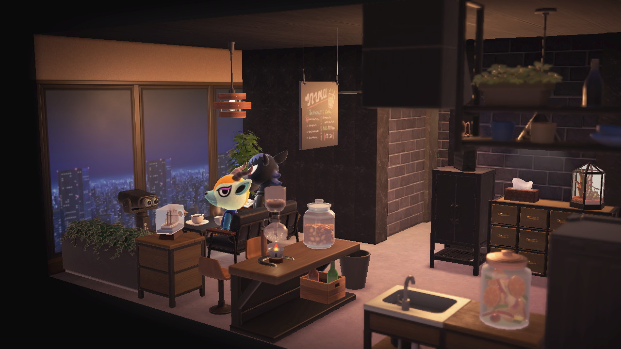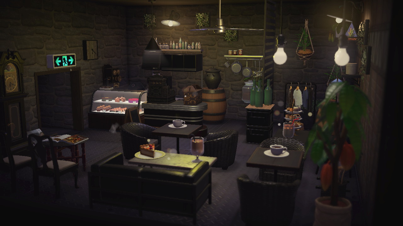 ↑これはハピパラの活動拠点となる島に建設された「カフェ」の内装である。かなり序盤に作った施設レイアウトだ。たくさん作るごとにだんだん特殊効果や家具が解禁されていくので、今見るともう少し工夫できるところもあるが、まぁ「かっこいい」と言っていいと思う。